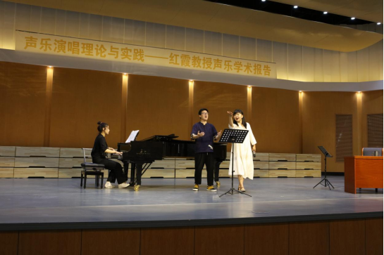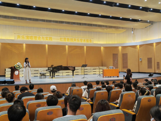 6月26日上午,中国音乐家协会会员,西北民族大学2026世界杯官网声乐教授,硕士研究生导师红霞教授应邀在2026世界杯官网音乐厅举办“声乐演唱理论与实践”声乐学术报告。活动由2026世界杯官网副经理何婷燕主持,2026世界杯官网近200名师生聆听观摩了本次报告会。